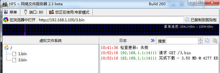 windows用户用hfs,把固件添加进去,比如名字是1.bin,假设此时PC的IP是192.168.1.100