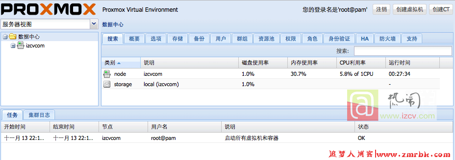 7. 成功登陆之后,即可看到简介又强大的proxmox面板。